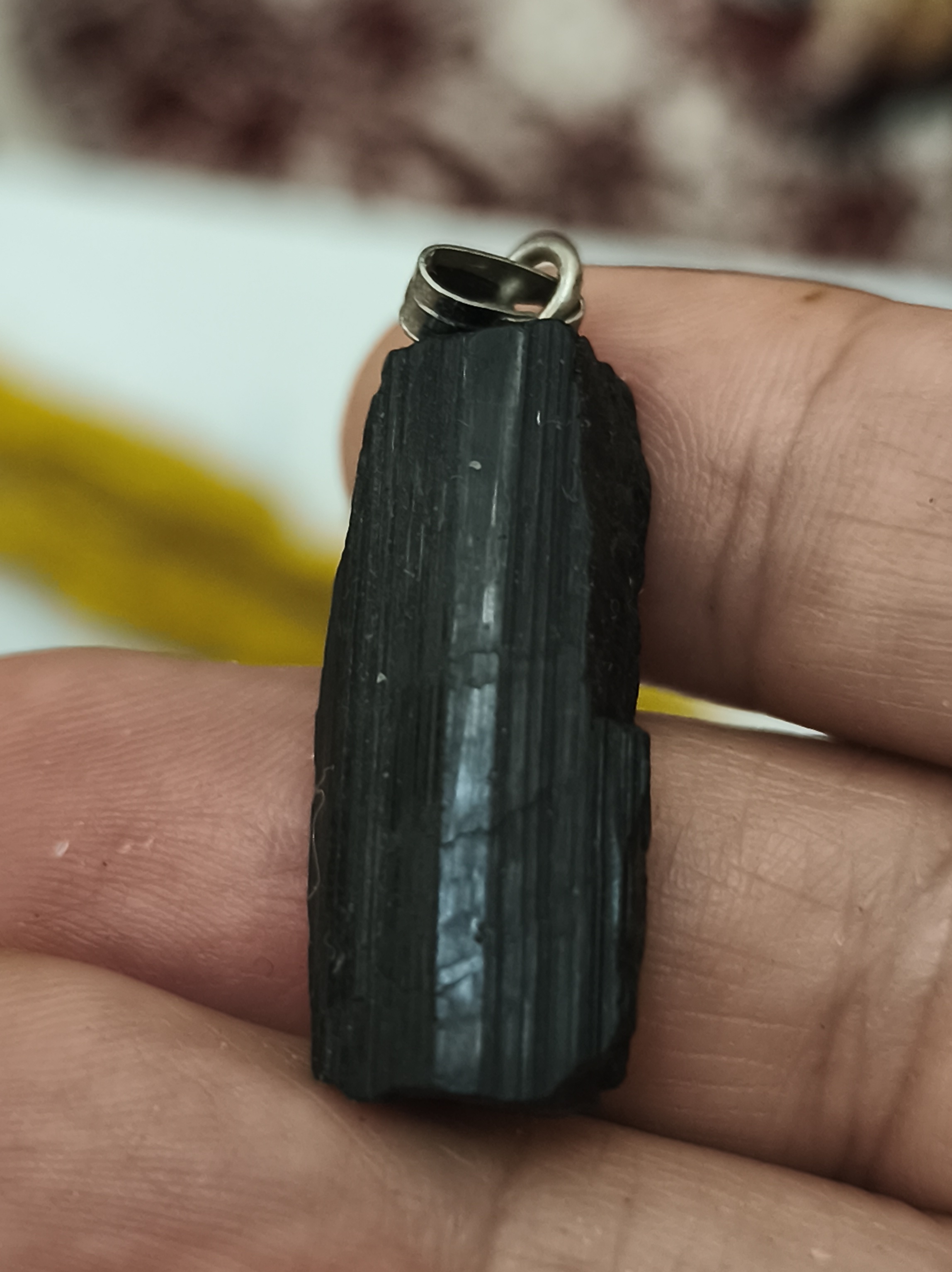 گردنبند سنگ تورمالین سیاه هند منشوری تراش دست با زنجیر ویتالی یا بند چرم
