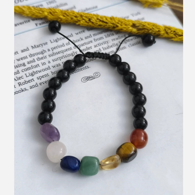 دستبند هفت چاکرا تامبل سنگ اصل طبیعی عقیق کارنلین چشم ببر سیترین آونتورین سبز لاجورد رزکواتز آمیتیست اونیکس با گره کشوی