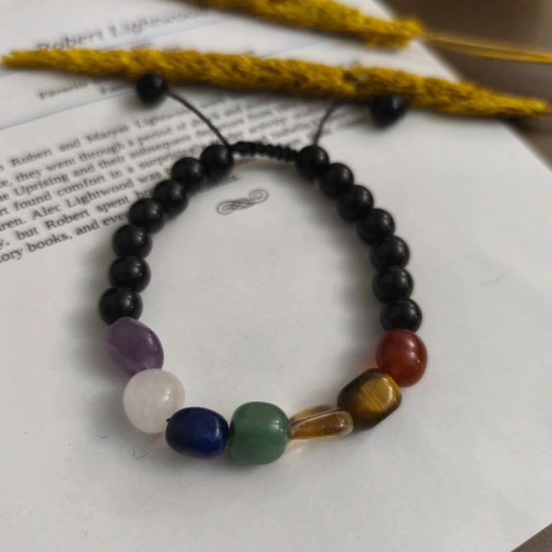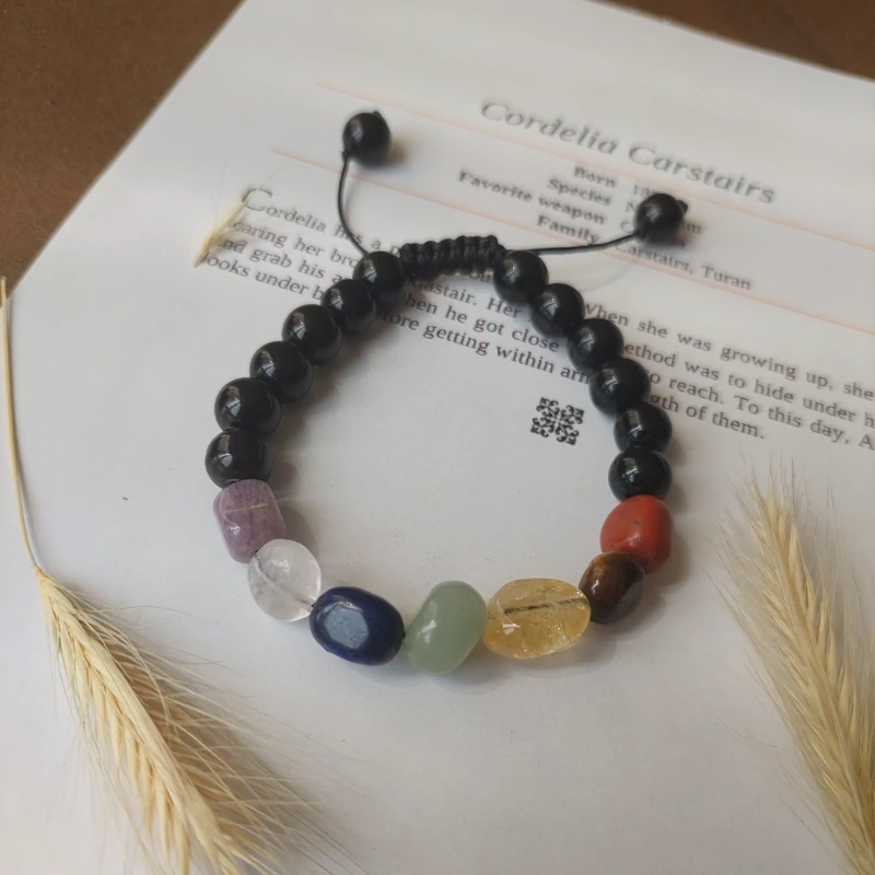 دستبند هفت چاکرا تامبل سنگ اصل طبیعی عقیق کارنلین چشم ببر سیترین آونتورین سبز لاجورد رزکواتز آمیتیست اونیکس با گره کشوی