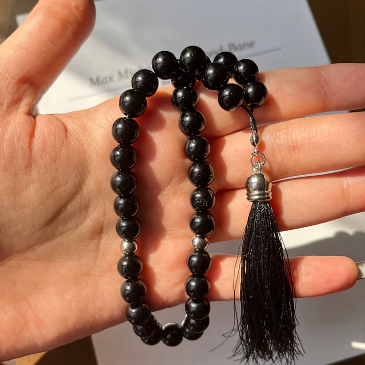 تسبیح اونیکس سیاه براق 33 دانه سایز 8 سنگ اونیکس اصل طبیعی