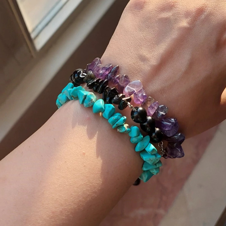 دستبند سنگ آمیتیست چیپسی راف یا تراش نخورده با گره کشویی قابل تنظیم سایز