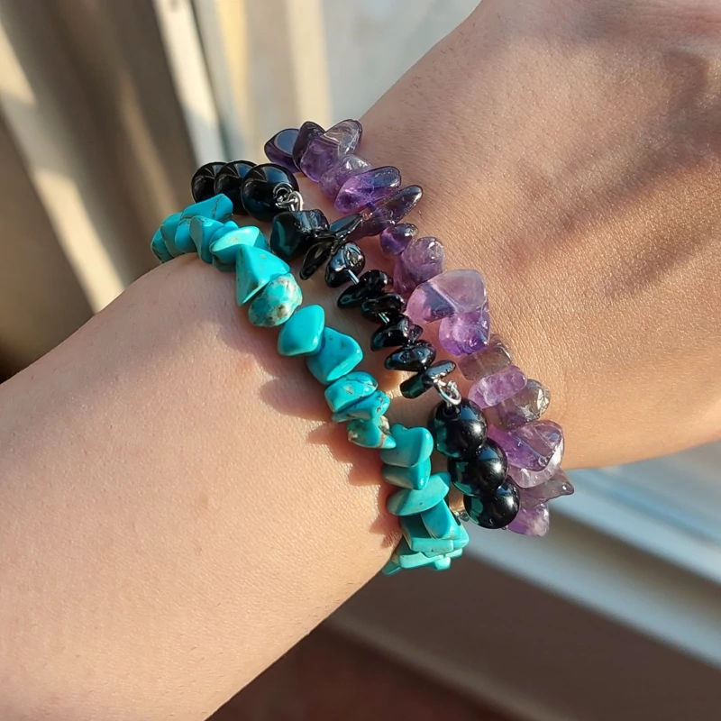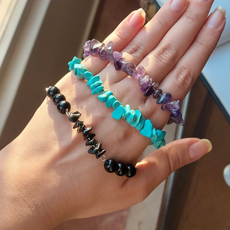 دستبند سنگ آمیتیست چیپسی راف یا تراش نخورده با گره کشویی قابل تنظیم سایز