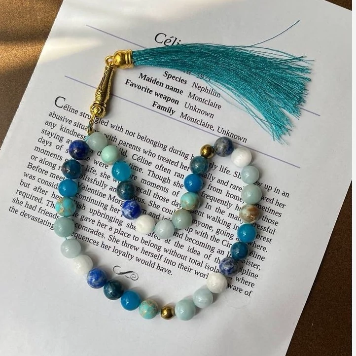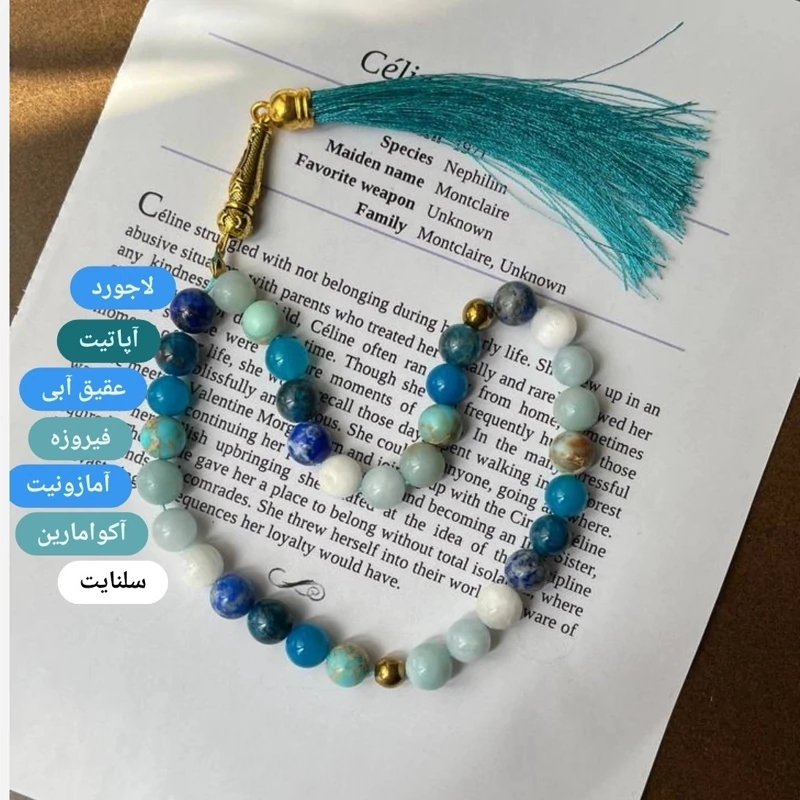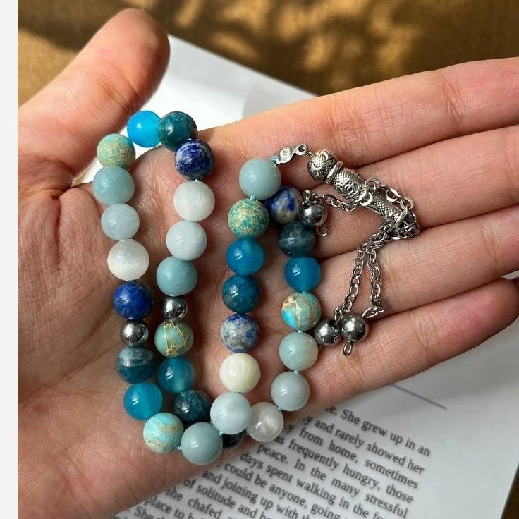 ✨ تسبیح آبیِ آسمانی ✨ ترکیبی از سنگهای لاجورد، آپاتیت، عقیق آبی، فیروزه، آمازونیت، آکوامارین و سلنایت یه تسبیح خاص که انگار از دلِ آسمون، دریا و آرامش ساخته شده... 🌊🌌☁️ 💎 خواص سنگها: 🔷 لاجورد (Lapis Lazuli) سنگ دانایی، حقیقت و صداقت بهت کمک میکنه صدای درونت رو بشنوی و با شجاعت از خودت دفاع کنی. 🔹 آپاتیت (Apatite) سنگ الهام و انگیزه به ذهن نظم میده و تمرکز رو بالا میبره. برای شروعهای تازه خیلی عالیه. 🔷 عقیق آبی (Blue Agate) سنگ آرامش، اعتماد و تعادل انرژیهای منفی رو دور میکنه و به قلبت آرامش میده. 🔹 فیروزه (Turquoise) سنگ محافظ و خوششانسی از قدیم برای محافظت از چشم زخم و انرژیهای بد استفاده میشده. 🔷 آمازونیت (Amazonite) سنگ صداقت، صلح و آرامش به ارتباط بهتر کمک میکنه و احساسات منفی رو پاکسازی میکنه. 🔹 آکوامارین (Aquamarine) سنگ دریا و شجاعت بهت آرامش درونی میده و کمک میکنه با ترسات روبهرو بشی. 🔷 سلنایت (Selenite) سنگ پاکی و نور تمام انرژیهای منفی رو از بین میبره و باعث میشه سبکتر و روشنتر بشی. 🌈 این تسبیح برای پاکسازی انرژی، آرامش، ارتباط درونی، شروع نو و محافظت روحی خیلی عالیه.