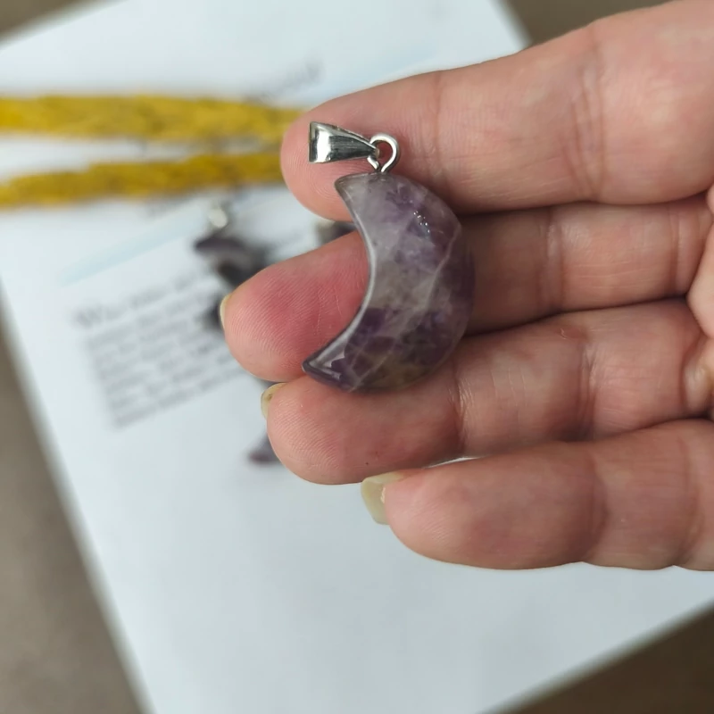 🌙 گردنبند "ماه بنفش" 🌙 ساختهشده با سنگ خاص و دلربای آمیتیست لیس آگات، آمیختهای از آرامشِ شب، درک درون و انرژی ماهانه... این گردنبند، مثل ماهی بنفشرنگ وسط آسمون شب، حس لطیفِ زنانگی، تعادل روحی و آرامش احساسی رو با خودش میاره... ✨🌌 💎 خواص سنگ آمیتیست لیس آگات مدل ماه: 🔹 تعادل احساسی: آرامکنندهی دل و ذهن، مخصوصاً توی دورانهای حساس مثل ماه تولد یا پریود. 🔹 تقویت قدرت زنانه: کمک به شهود، قدرت درونی و ارتباط با طبیعت زنانه. 🔹 محافظ آرام: انرژیهای منفی رو از اطرافت دور میکنه و هالهت رو پاکسازی میکنه. 🔹 تقویت رؤیاها و خواب آگاه: برای مدیتیشن شبانه یا خواب عمیق و رؤیابین خیلی کاربردیه. 🌀 گردنبند "ماه بنفش" یه همراه صبور و درخشانه برای وقتایی که میخوای با خودت مهربونتر باشی، آرامش داشته باشی، و دوباره بدرخشی
