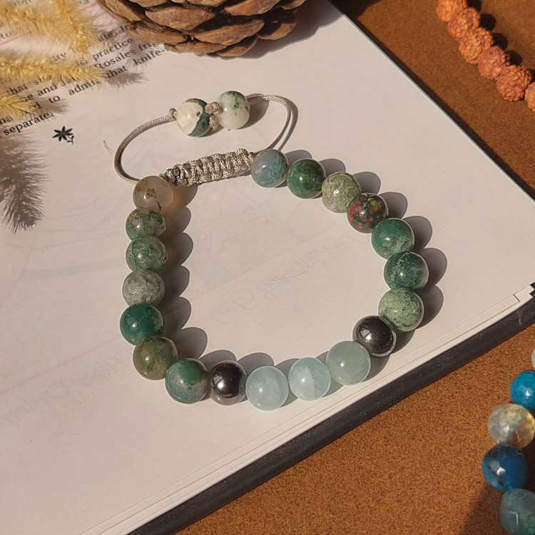 دستبند سنگ آکوامارین و عقیق خزه ای سنگ اصل درجه یک با نخ ابریشم و گره کشویی