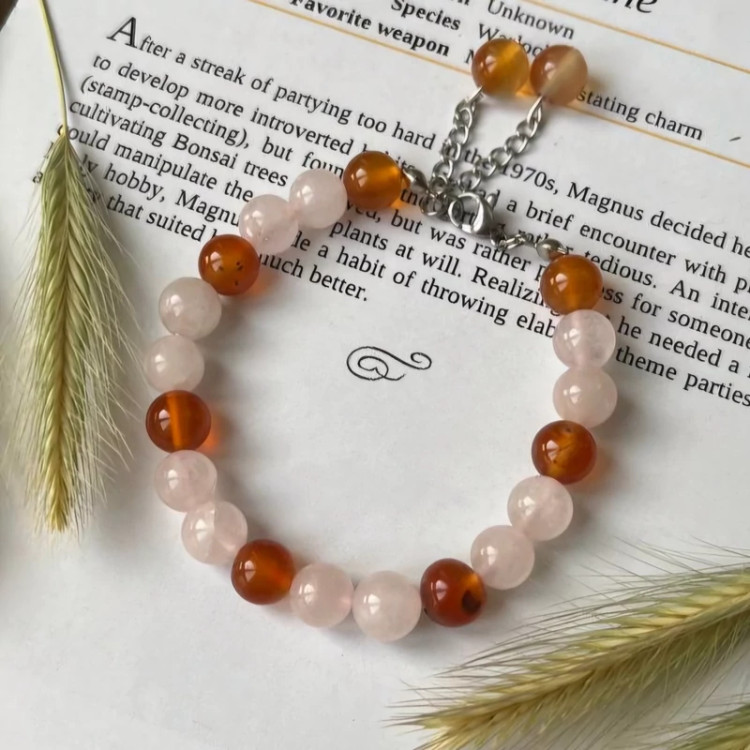 دستبند سنگ عقیق کارنلین و رز کوارتز با قفل استیل رنگ ثابت