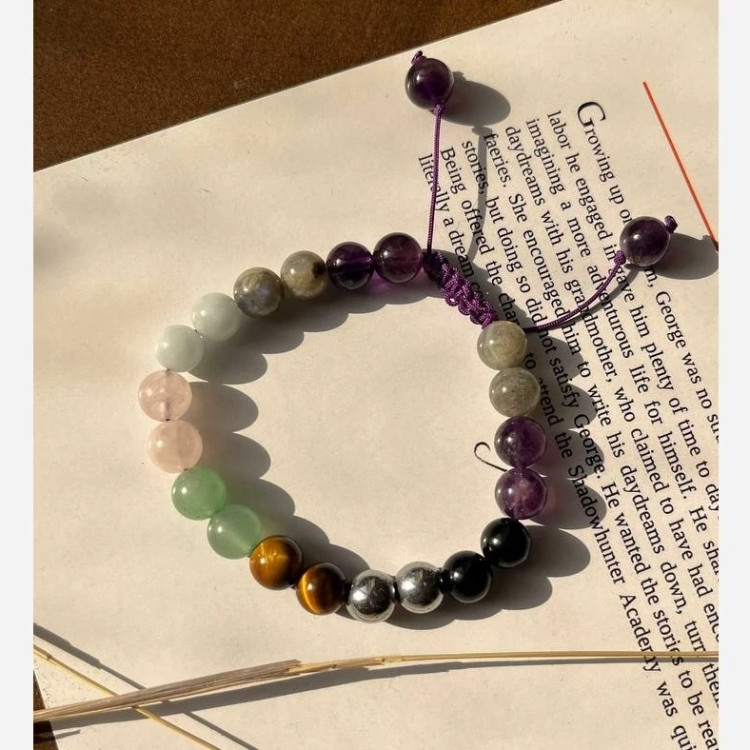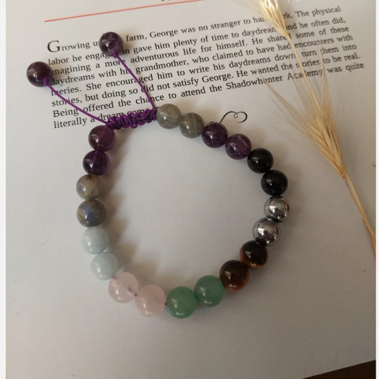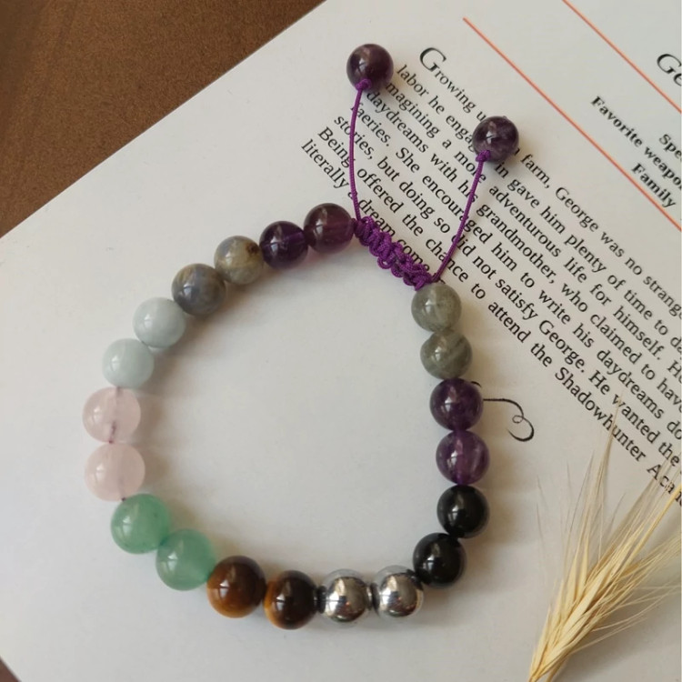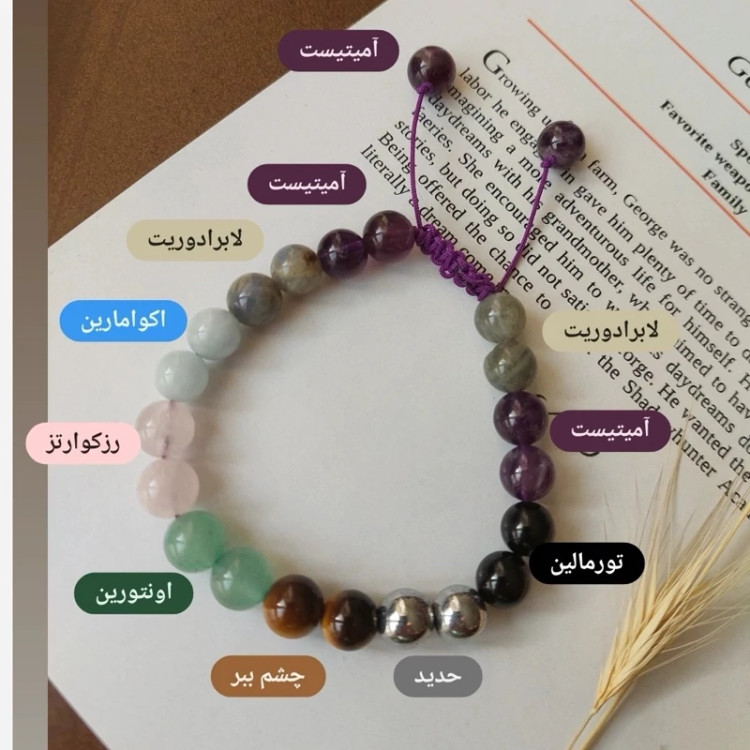 ✨ دستبند چندجواهری فولانرژیک با سنگهای آمیتیست، لابرادوریت، آونتورین، رزکوارتز، حدید، آکوامارین، تورمالین سیاه و چشم ببر