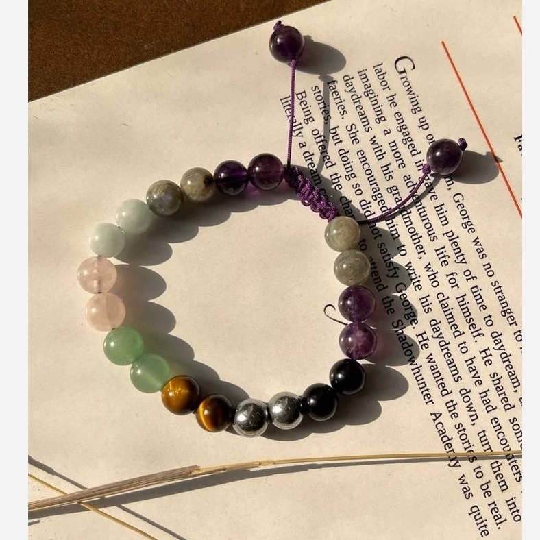 ✨ دستبند چندجواهری فولانرژیک با سنگهای آمیتیست، لابرادوریت، آونتورین، رزکوارتز، حدید، آکوامارین، تورمالین سیاه و چشم ببر