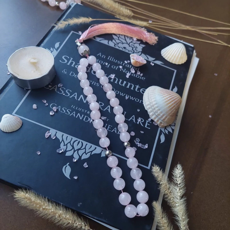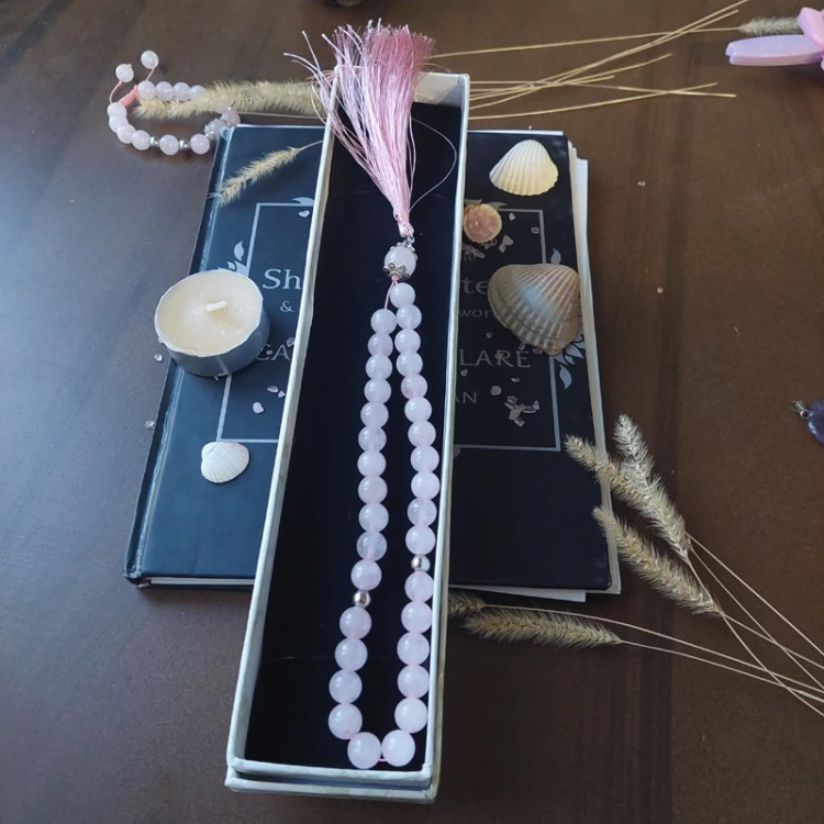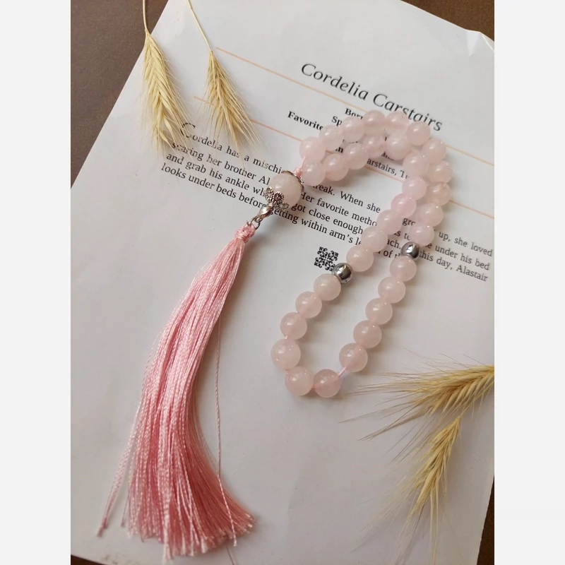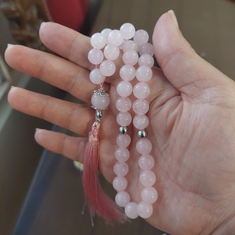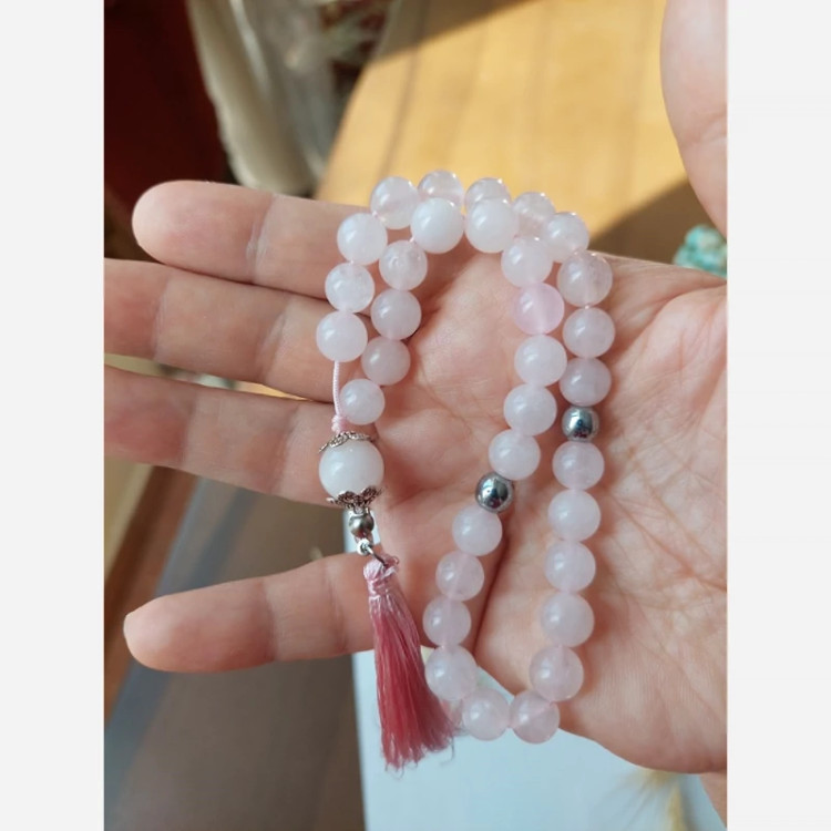 تسبیح سنگ رزکوارتز اصل سایز 8 ساخته شده با حدید ونخ درجه یک