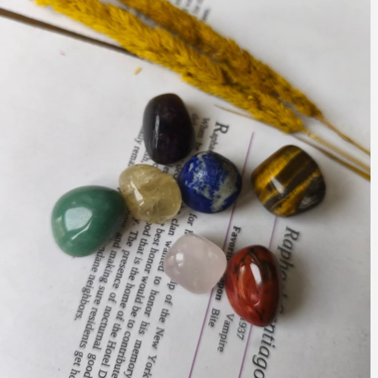 سنگهای آمیتیست ،سیترین،رزکوارتز، چشمببر ،آونتورین سبز ؛لاجورد؛جاسپر قرمز به هفت نقطه انرژی در بدن اشاره دارن و با بهبود جریان انرژی در این نقاط، احساس آرامش و تعادل در بدن رو افزایش میدن✨️ 💕خواص: بهبود تعادل انرژی در بدن، افزایش آرامش و تمرکز، افزایش انرژی و تحرک، کمک به بهبود خلق و خو، کاهش اضطراب و استرس، کمک به بهبود ارتباطات اجتماعی💕 به علت طبیعی بودن سنگها؛ اختلاف در رنگ و سایز سنگها تا حدودی وجود دارد. وزن پکها بین 80تا 90 گرم می باشد.