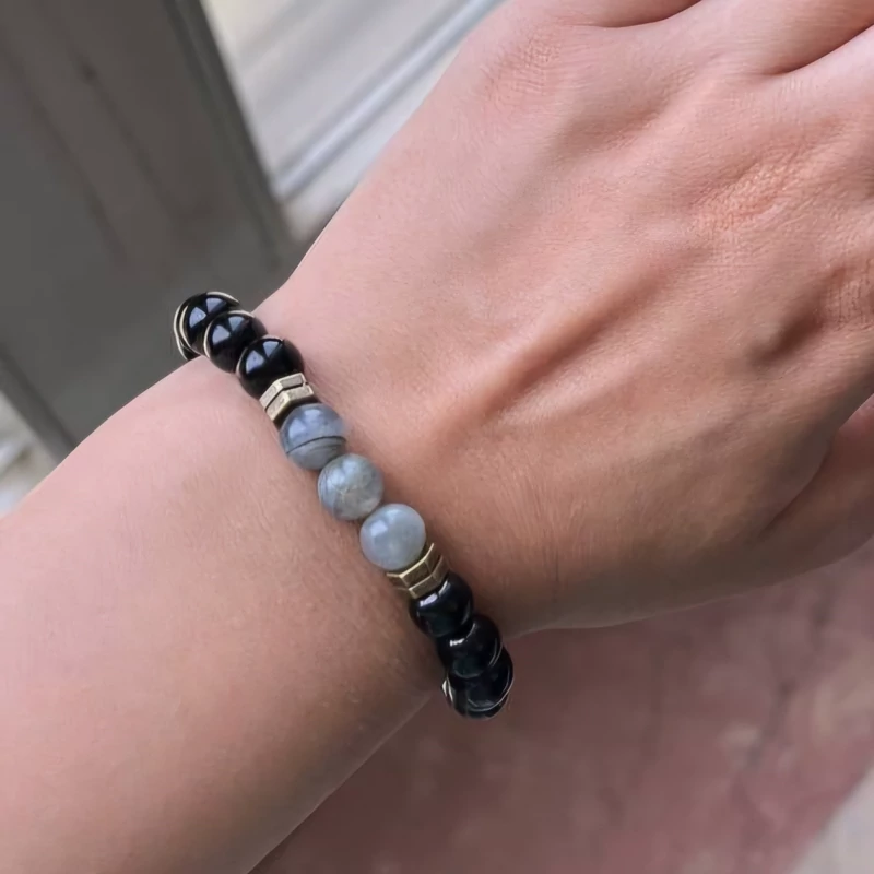 دستبند کشی سنگ اونیکس سیاه و لابرادوریت سنگ اصل درجه یک طبیعی