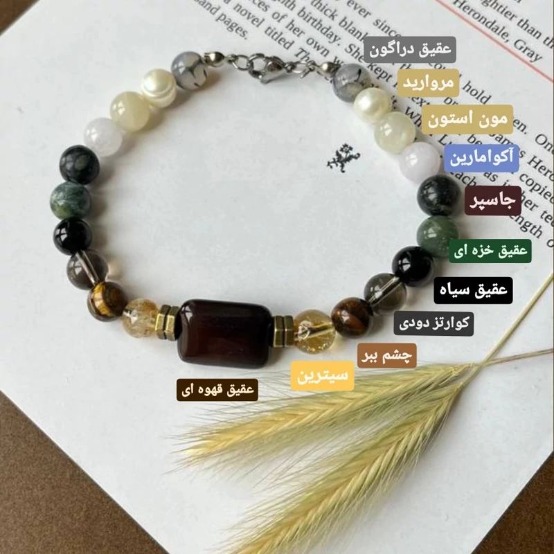 دستبند ماه خرداد مروارید عقیق آکوامارین سیترین جاسپر مون استون سنگ اصل طبیعی
