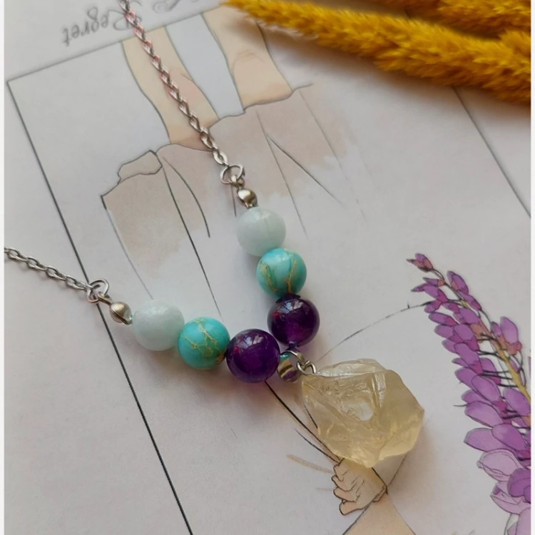 این گردنبند با سنگهای اصل آکوامارین آمیتیست و فیروزه آفریقایی و قفل استیل ساخته شده آویز این گردنبند سنگ سیترین می باشد. سایز سنگها 8 میل می باشد آکوامارین به معنای آبدریا🪼🩵 آکوامارین سنگ شجاعت و وقار هست. این سنگ سمبل آرامش هست و برای مدیتیشن فوق العاده هست چون باعث ایجاد آرامش در طبیعت و شخصیت دارنده اش می شود و استرس و اضطراب را کاهش می دهد. اگر ترس از سخنرانی در مجامع عمومی را دارید حتما از اسن سنگ استفاده کنید . این سنگ برای درمان دردهای گلو و گردن بسیار مفید هست. سیترین✨️💛 این سنگ به عنوان سنگ موفقیت شناخته می شود چون باعث افزایش موفقیت و فزونی به ویژه در کسب و کار می شود. اسم دیگه سیترین، سنگ تاجر هست چون بسیازی از صاحبان کسب و کار این سنگ رو در کنار ثروت خود نگهداری میکنند تا باعث افزایش موفقیت در تجارتشون بشه🧚🏻♀️ 💕خواص:افزایش ثروت، افزایش هوش، انرژیزا، افزایش خلاقیت، کاهش کابوسهای شبانه، کاهش نگرانی، کاهش عصبانیت، تعادل روح، کاهش از بین برنده انرژی منفی، کاهش استرس، تقویت اعتماد به نفس💕