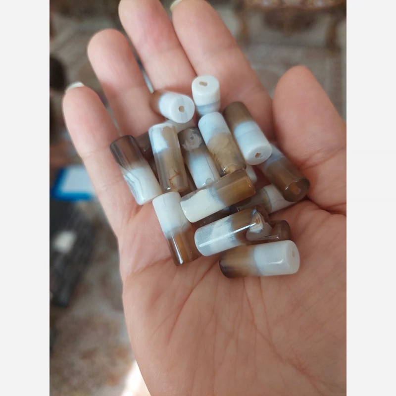 مهره عقیق دو رنگ استوانه ای سنگ اصل طبیعی دو طرف سوراخ دار میانکار