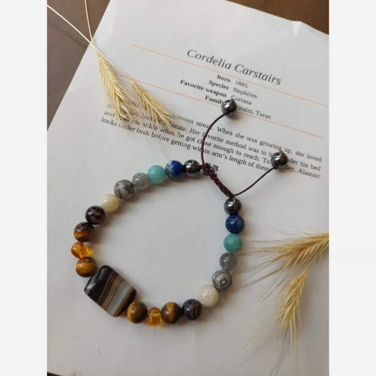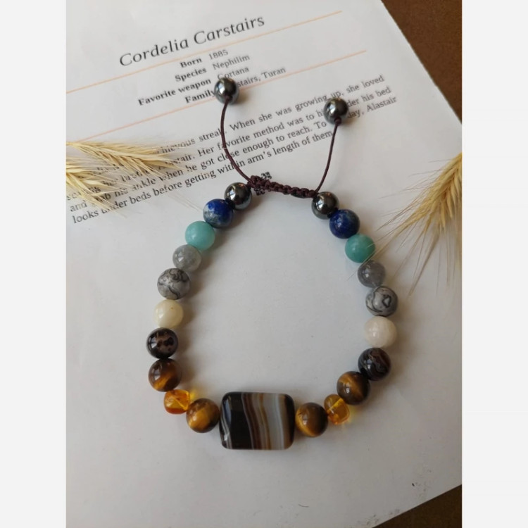 این دستبند با نخ درجه یکبرند دندلیون ساخته شده و همه سنگهای طبیعی اصل درجه یک سایز 8 میل می باشند. سنگ وسط عقیق ماداگاسکار قهوه ای می باشد که چون سنگ طبیعی هست در هر دستبند متفاوته و دقیق مثل این سنگ نمی باشد.برای دور مچ ۱۸به بالا مناسبه. دستبند شامل عقیق قهوهای ماداگاسکار چشم ببر کهربا عقیق سلیمانی مون استون جاسپر لابرادوریت امازونیت لاجورد حدید می باشد.