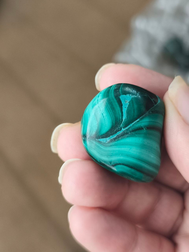 مالاکیت (Malachite) با رنگ سبز تیره و رگههای جذابش، به عنوان سنگ محافظ و دگرگونی شناخته میشود. این تامبل زیبا انرژیهای منفی را جذب و تبدیل به آرامش درونی میکند.