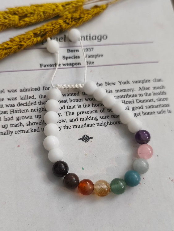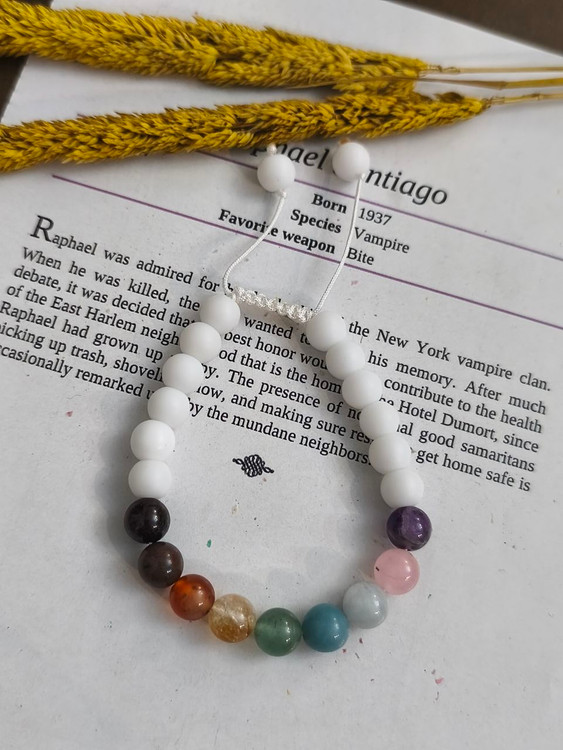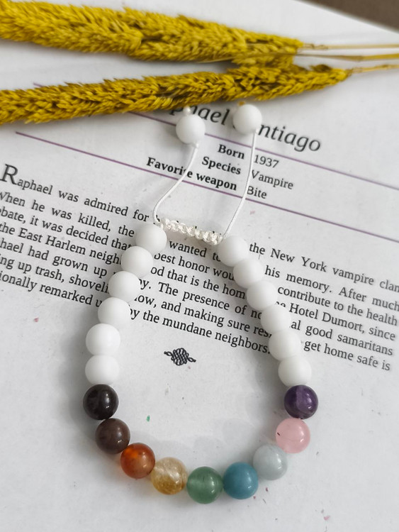 دستبند سنگ ماه تیر، ترکیبی شگفتانگیز از سنگهای طبیعی و انرژیزا شامل گارنت، عقیق خزهای، کارنلین، آونتورین سبز، سیترین، رزکوارتز، آمیتیست، آکوامارین، امازونیت و اونیکس سفید است.