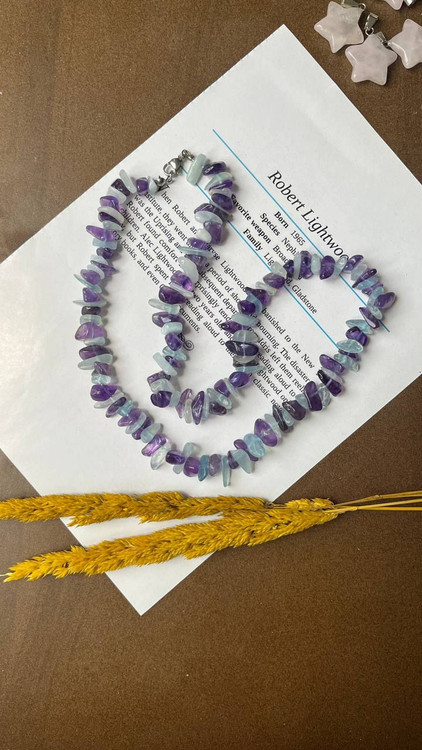 گردنبند سنگ آکوامارین و آمیتیست چیپسی ترکیبی دلانگیز از دو سنگ آرامشبخش و انرژیزا است که با هم هماهنگی ذهن و روح را ایجاد میکنند.