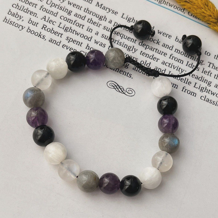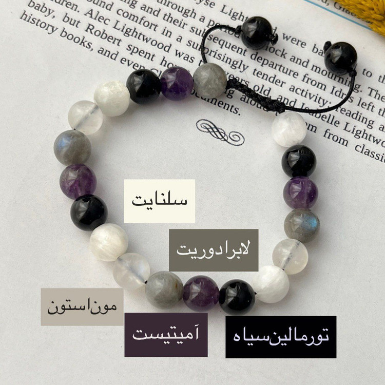 دستبند سنگهای طبیعی موناستون، لابرادوریت، تورمالین سیاه، سلنایت و آمیتیست ترکیبی از انرژی ماه، محافظت درونی و آرامش ذهن است.