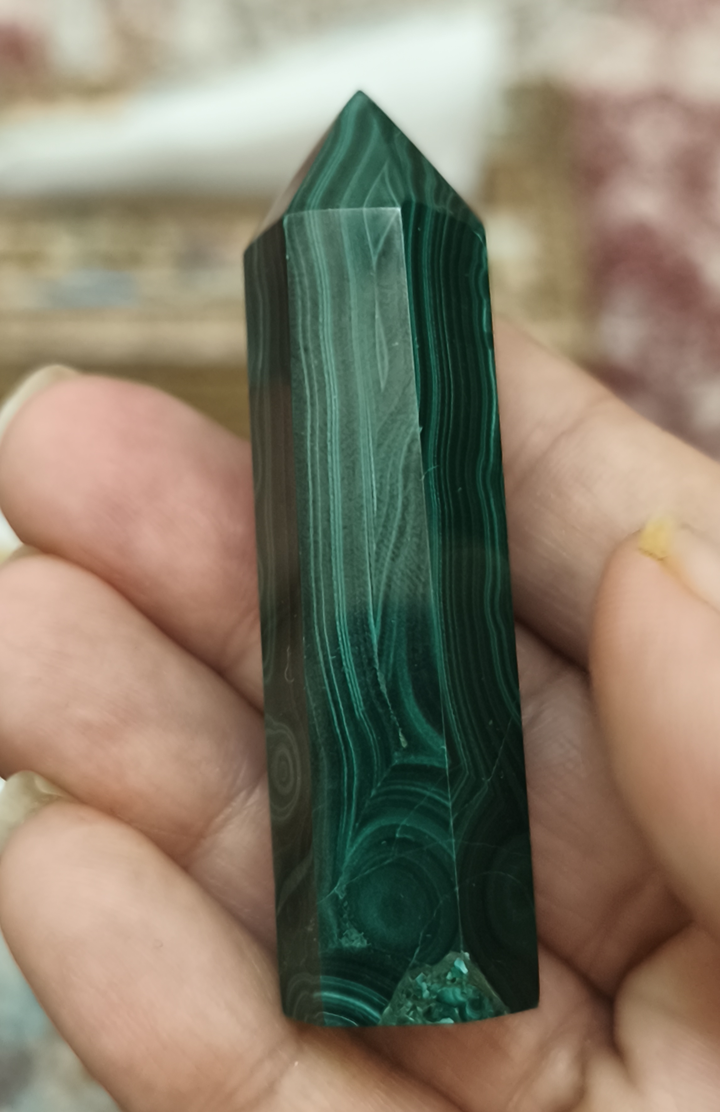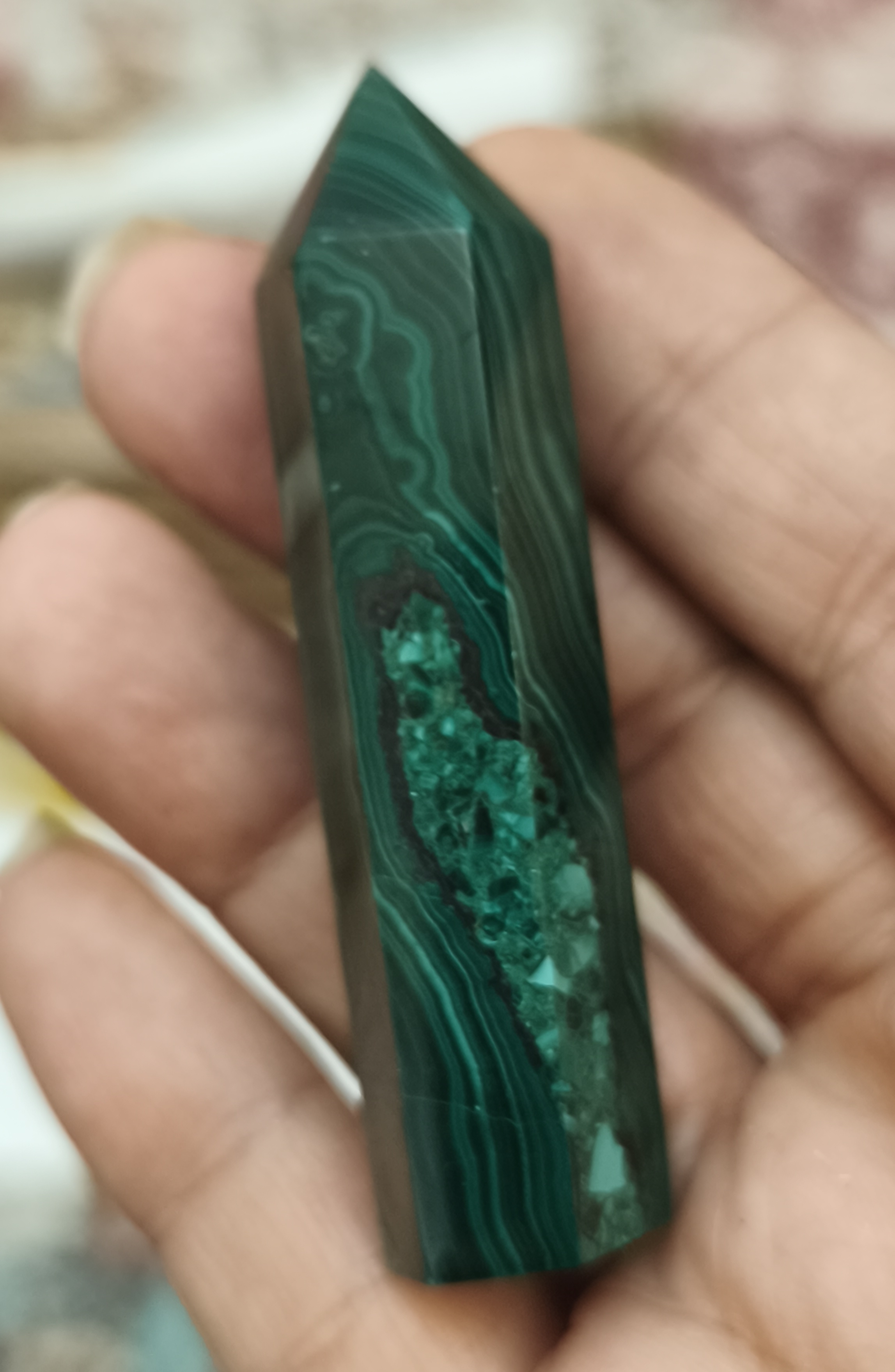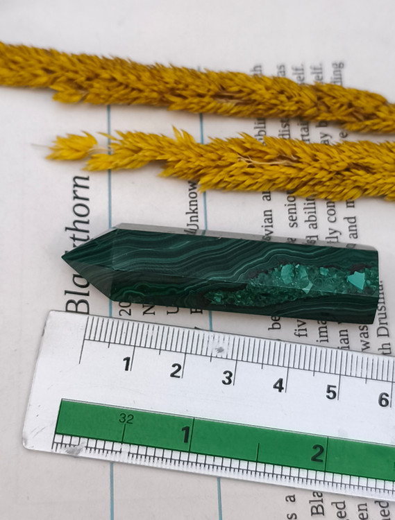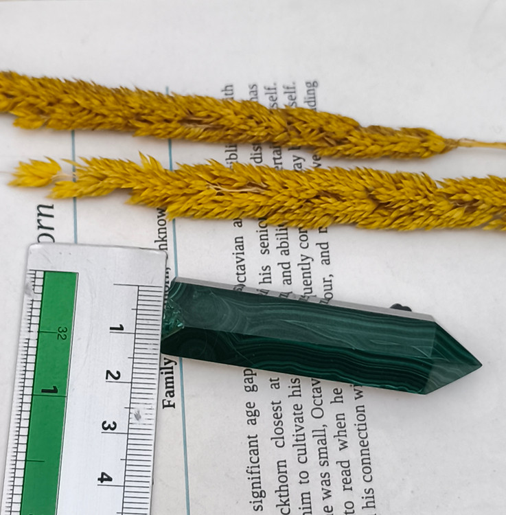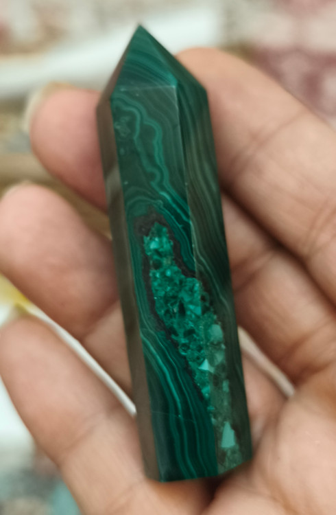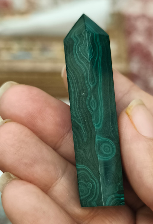 منشور مالاکیت کنگو، با رنگ سبز عمیق و خطوط طبیعی و الهامبخش خود، یکی از سنگهای قدرتمند در دنیای جواهرات و کریستالتراپی است.