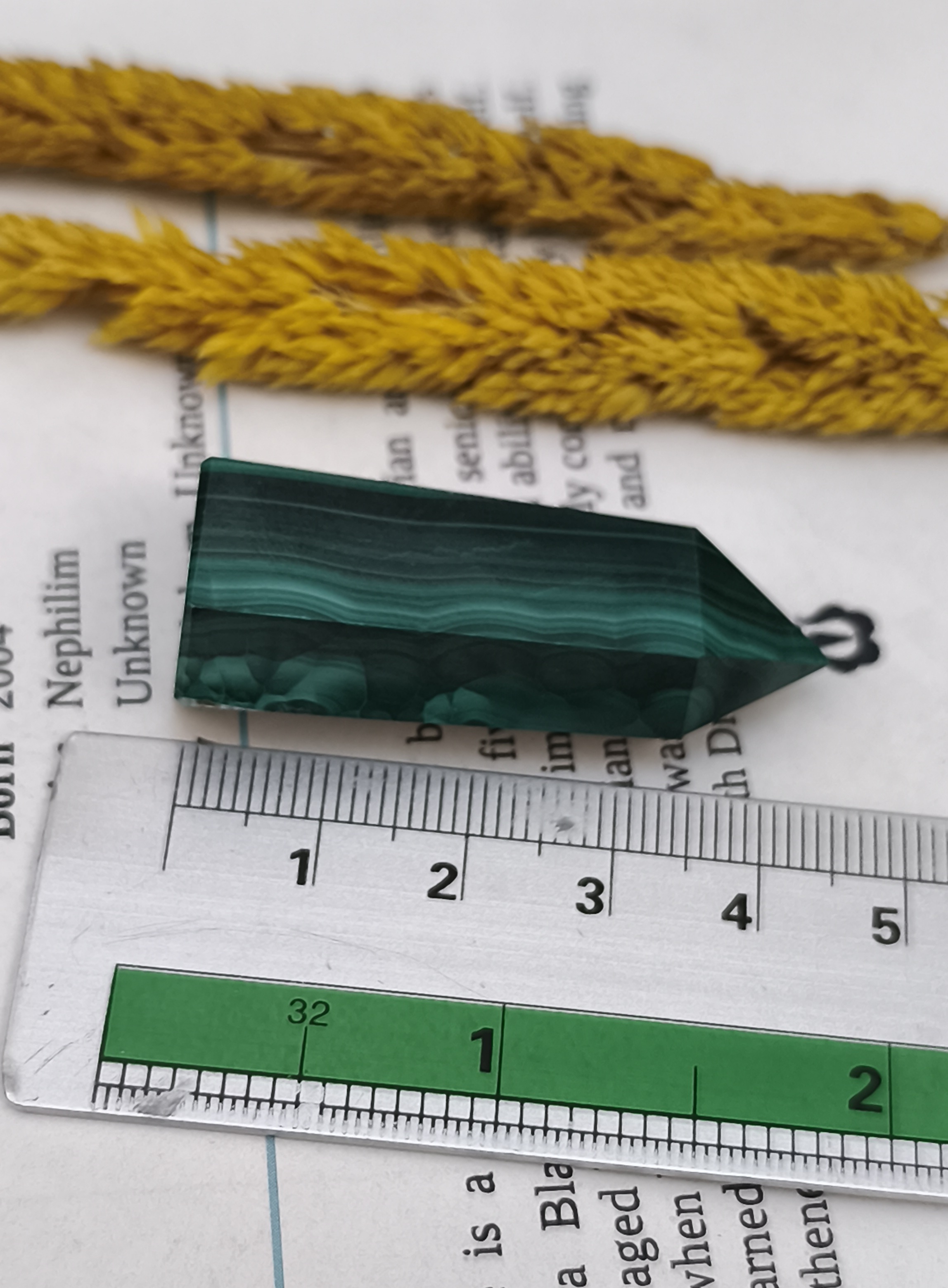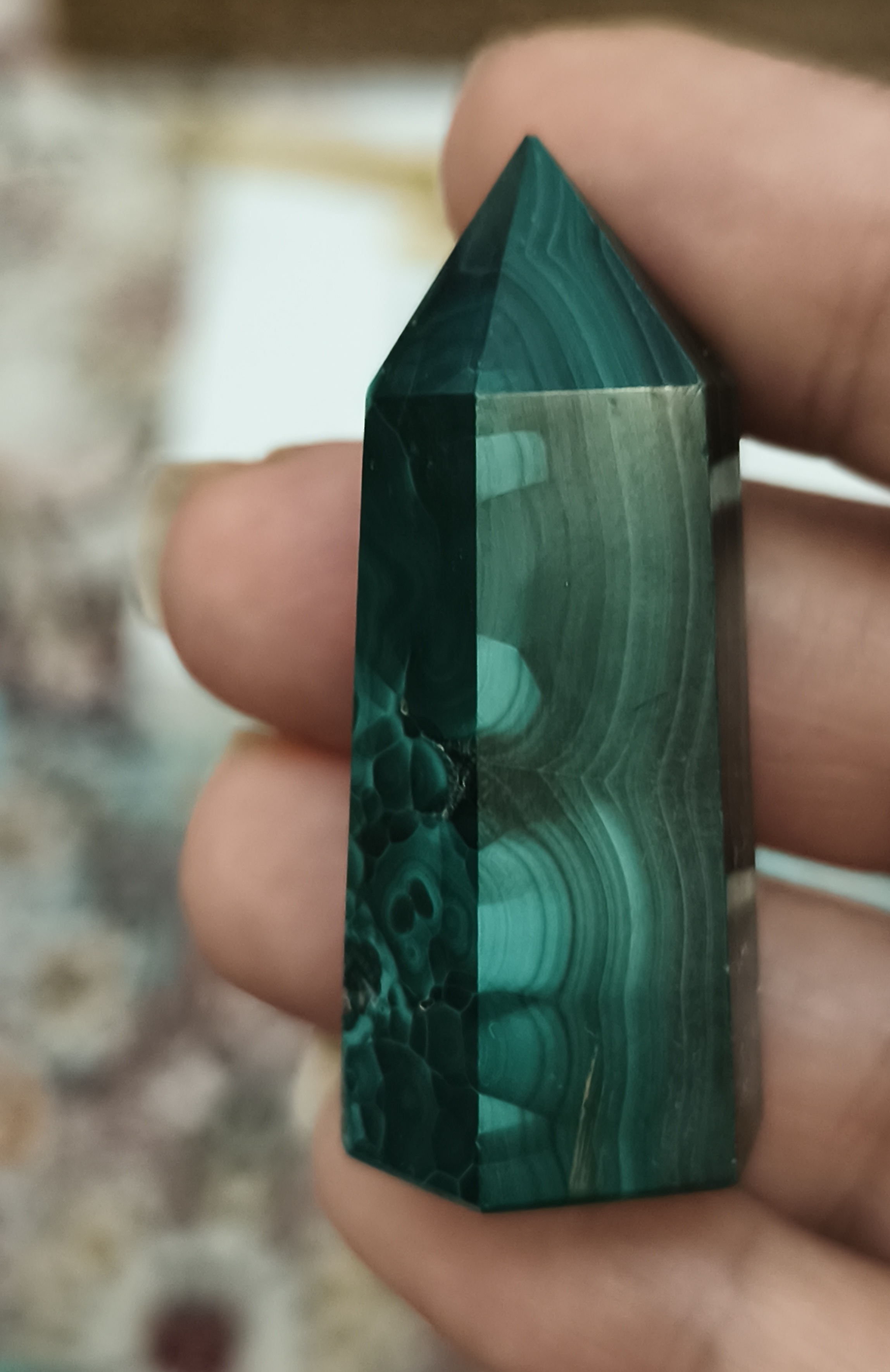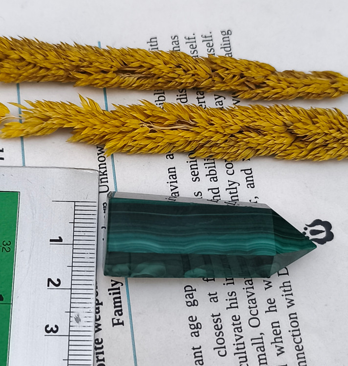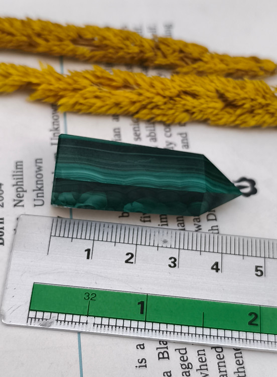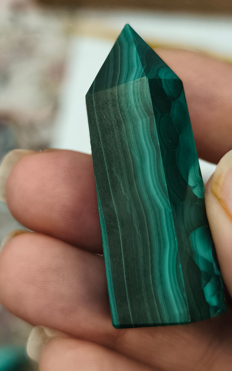 منشور مالاکیت کنگو، با رنگ سبز عمیق و خطوط طبیعی و الهامبخش خود، یکی از سنگهای قدرتمند در دنیای جواهرات و کریستالتراپی است.