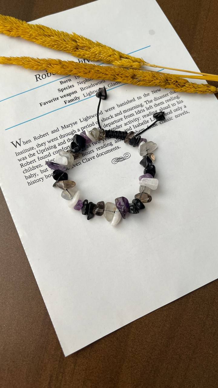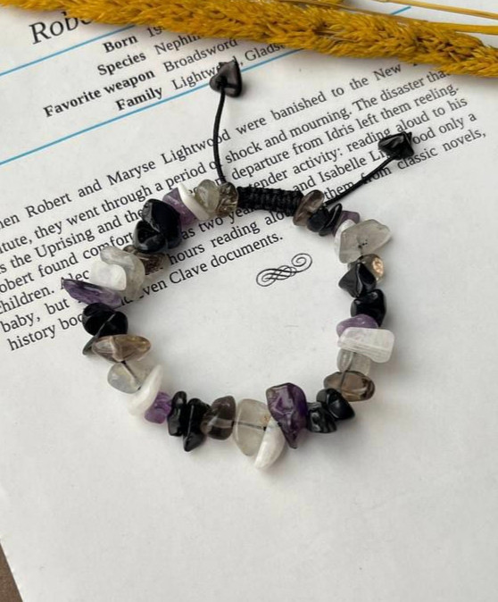 دستبند سنگهای کوارتز دودی، لابرادوریت، موناستون، آمیتیست، تورمالین سیاه و عقیق سیاه چیپسی؛ ترکیبی از حفاظت، آرامش و تعادل انرژی.
