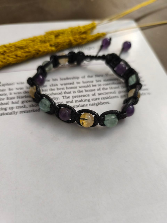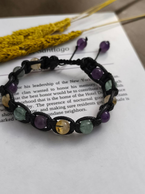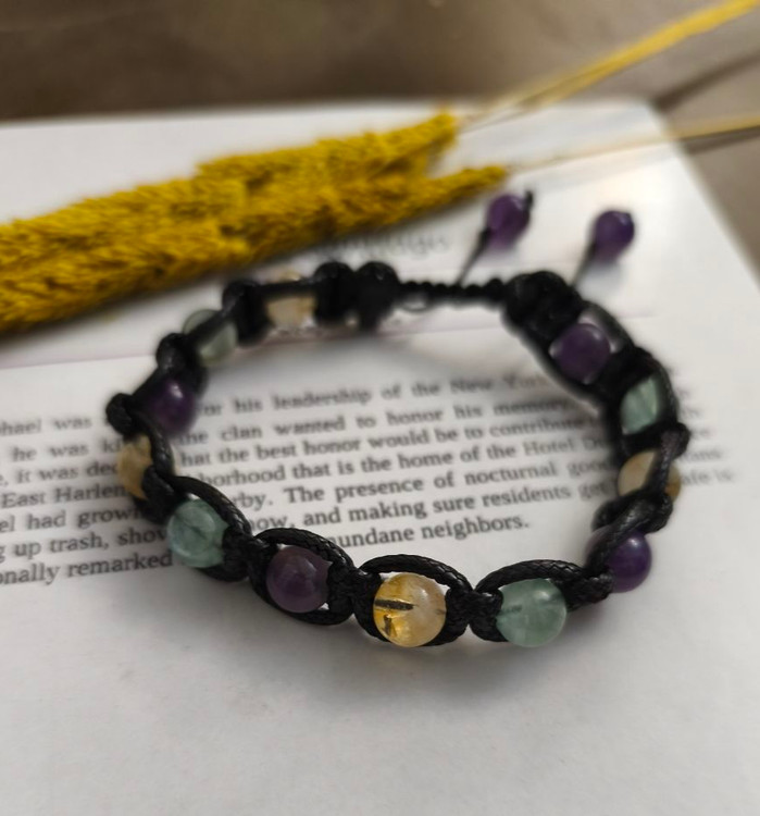 دستبند سنگهای فلوریت (Fluorite)، سیترین (Citrine) و آمیتیست (Amethyst) با بند چرمی، ترکیبی از تمرکز ذهن، آرامش روح و انرژی مثبت است.