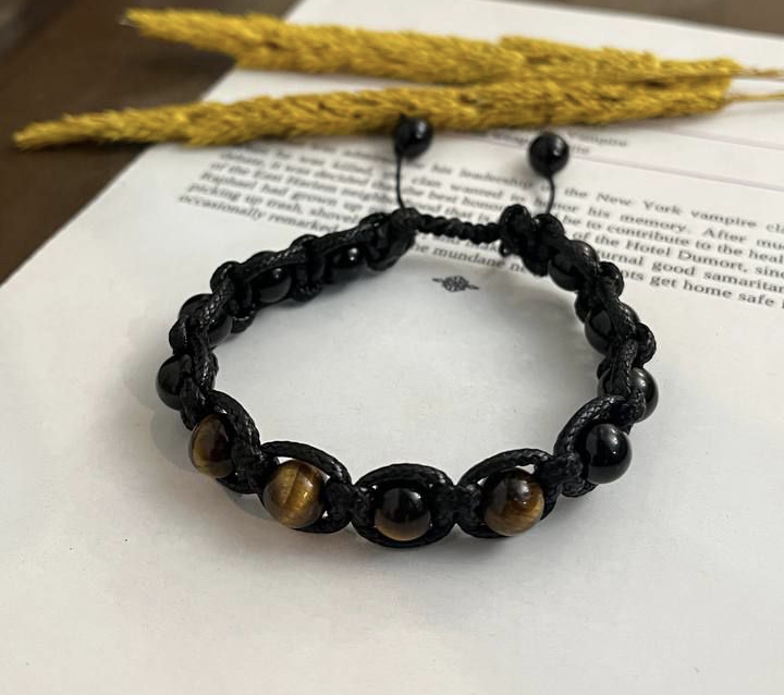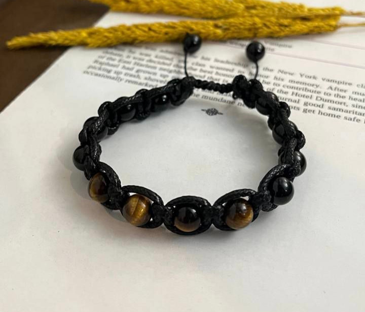 دستبند سنگهای تورمالین سیاه (Black Tourmaline) و چشم ببر (Tiger Eye) با بافت چرمی و گره کشویی، محافظ قدرتمندی در برابر انرژیهای منفی و ترسهای درونی است.