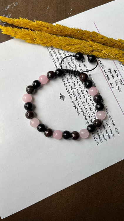 دستبند سنگهای طبیعی گارنت (Garnet)، اونیکس سیاه (Black Onyx) و رزکوارتز (Rose Quartz)، تلفیقی زیبا از قدرت، آرامش و عشق است؛ ساختهشده با گره کشویی قابل تنظیم از نخ مقاوم و سنگهای اصل و تراشخورده.