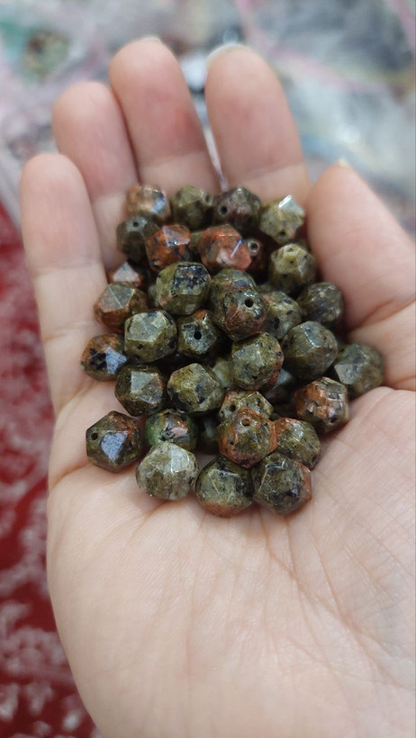 مهره سنگ سرپانتین سبز مغز پسته ای طرح اوناکیت سایز ۱۰تراش استار سوراخ دار