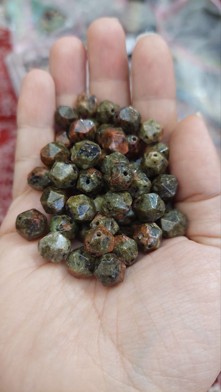 مهره سنگ سرپانتین سبز مغز پسته ای طرح اوناکیت سایز ۱۰تراش استار سوراخ دار