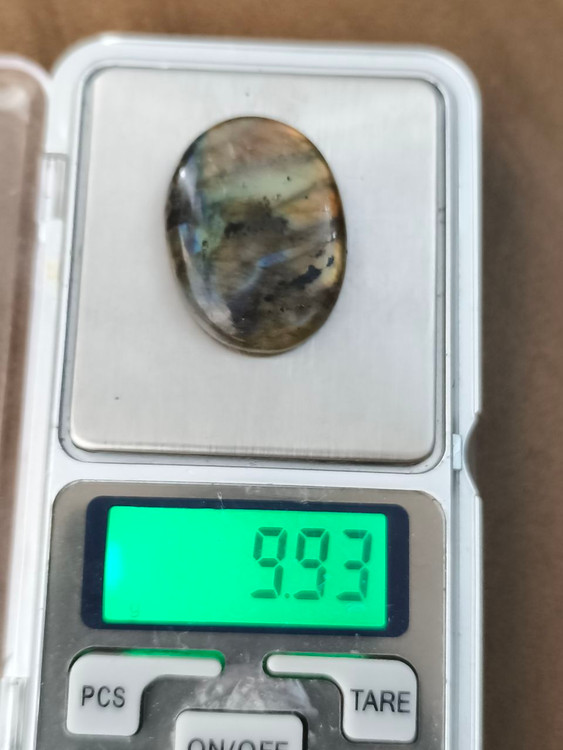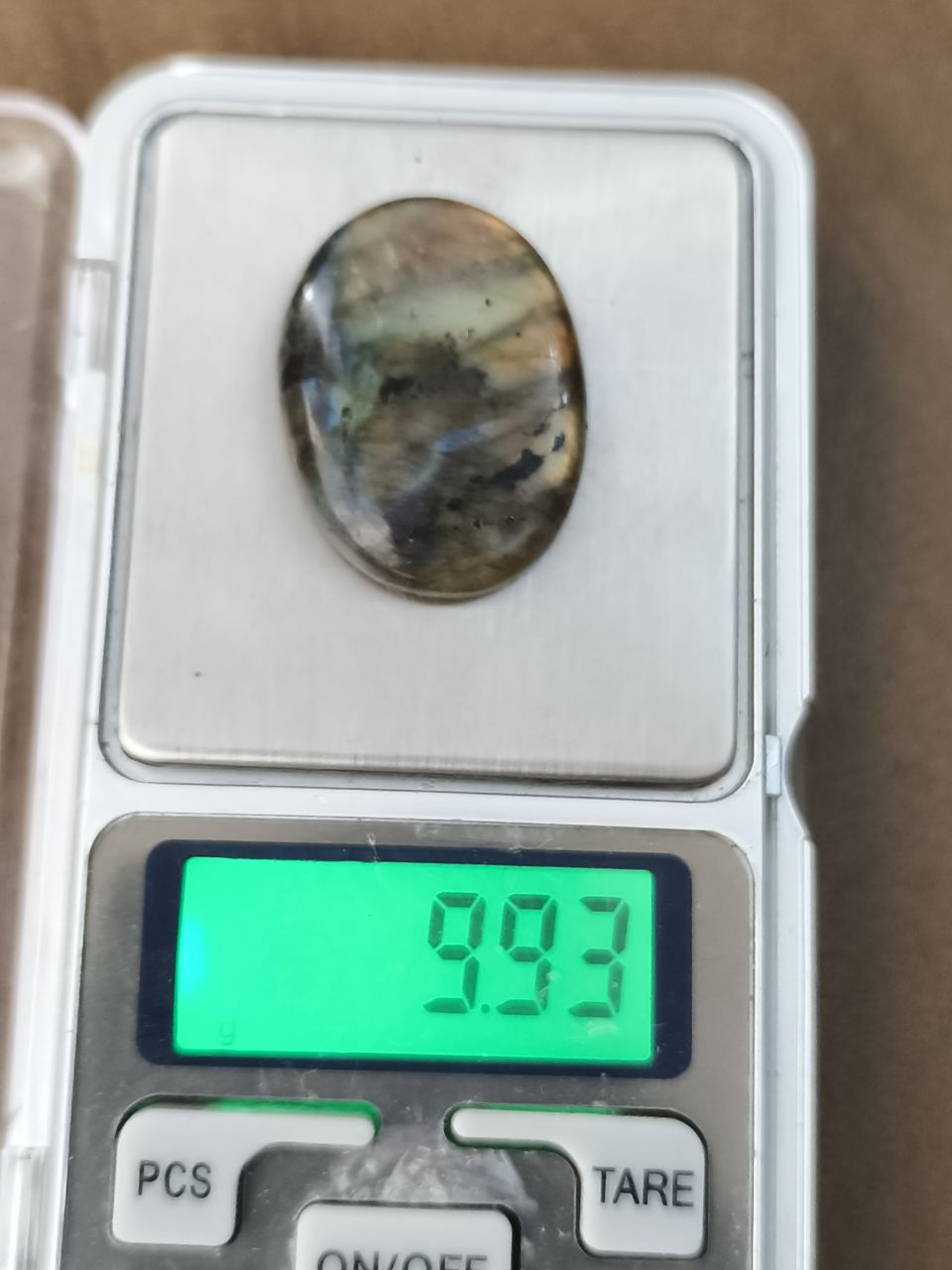 نگین لابرادوریت بیضی که به «سنگ جادوگران» یا «سنگ نور شمالی» معروفه، سنگی اسرارآمیز با بازی رنگهای آبی، سبز و طلاییه که درونش نوری جادویی پنهان شده.