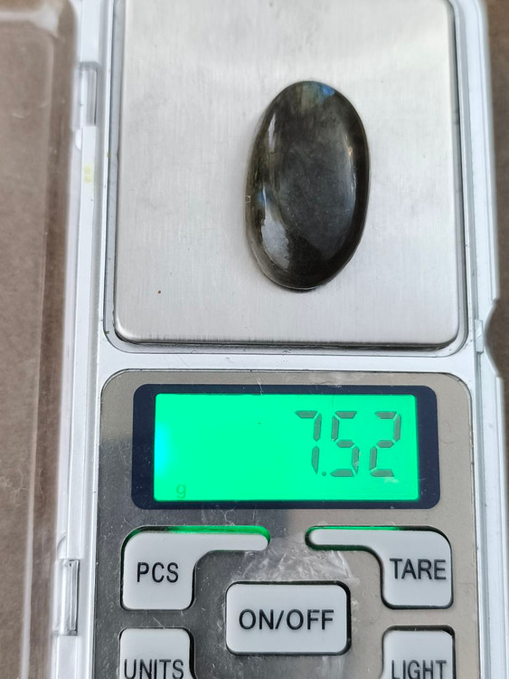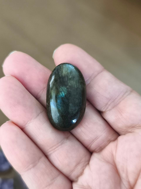 نگین لابرادوریت بیضی که به «سنگ جادوگران» یا «سنگ نور شمالی» معروفه، سنگی اسرارآمیز با بازی رنگهای آبی، سبز و طلاییه که درونش نوری جادویی پنهان شده.