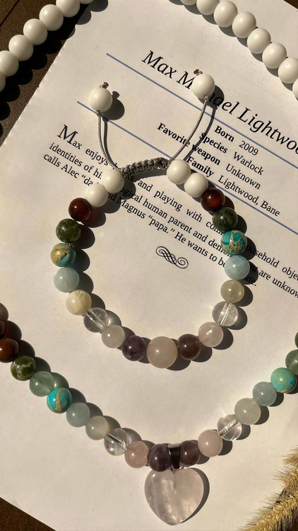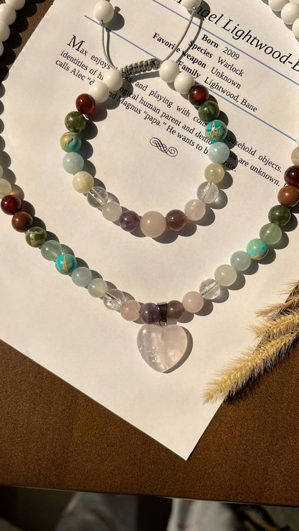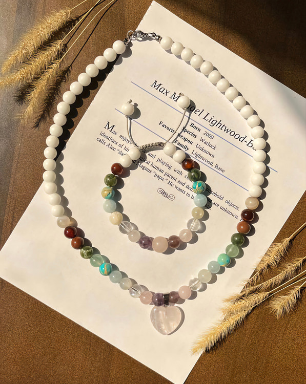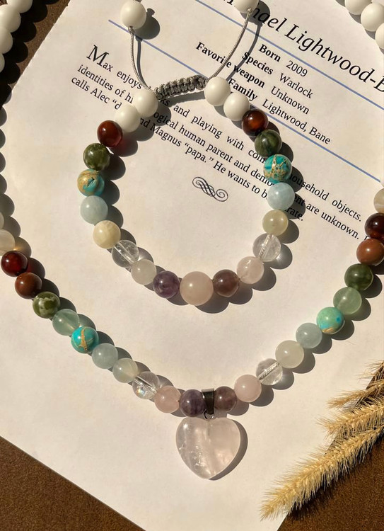 این نیمست گردنبند و دستبند ماه مهر با آویز قلب و سنگهای طبیعی و اصل طراحی شده است. از کنار آویز قلب، سنگها به ترتیب شامل: آمیتیست 💜، رزکوارتز 💗، کریستال کوارتز 🔮، مون استون 🌙، آکوامارین 💧، فیروزه 🦋، فلورین 💚، یشم 🍃، سنگ خون 🩸، عقیق سلیمانی 🛡️، عقیق شیری 🤍 و اونیکس سفید ⚪ هستند.