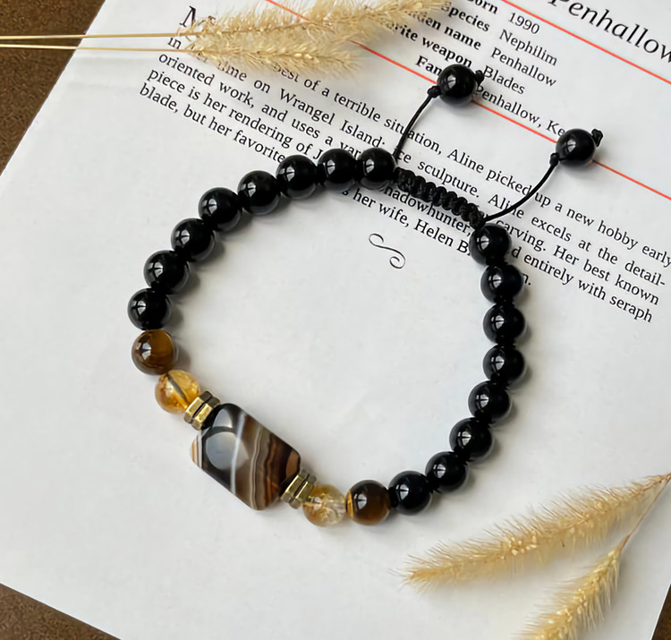🐅 توضیحات سایت دستبند سنگ چشم ببر، سیترین، عقیق سیاه با میانکار عقیق ماداگاسکار (گره کشویی)