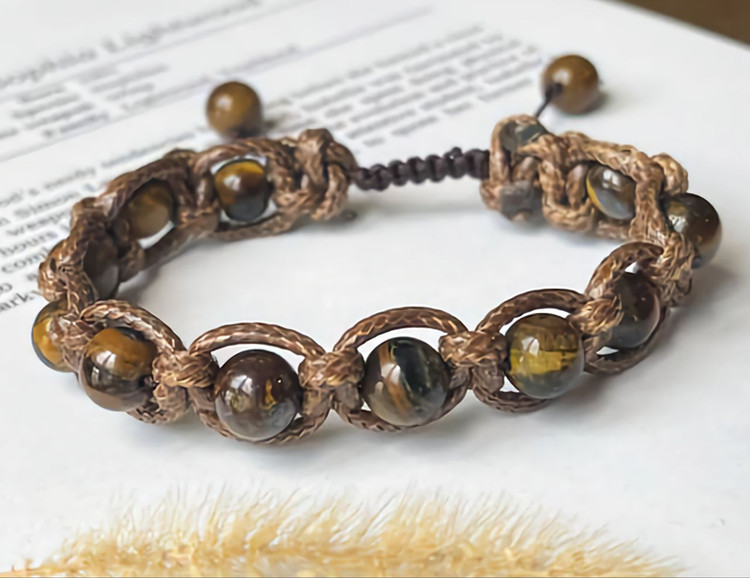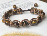 دستبند سنگ چشم ببر با بافت چرم و گره کشویی