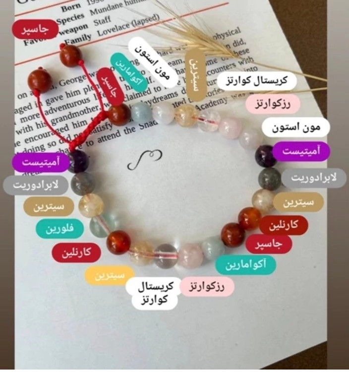 جاسپر قرمز انرژی و ثبات، آکوامارین آرامش، موناستون تقویت حس ششم، سیترین جذب ثروت، کوارتز شفاف افزایش قدرت انرژی، رزکوارتز عشق، آمیتیست آرامش ذهن، لابرادوریت محافظت از هاله، عقیق کارنلین انگیزه و خلاقیت و فلورین تمرکز و پاکسازی ذهن را تقویت میکنند.