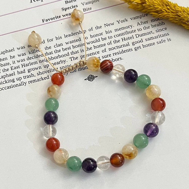 💎 دستبند سنگ سیترین، عقیق کارنلین، کوارتز شفاف، آمیتیست و آونتورین سبز با گره کشویی